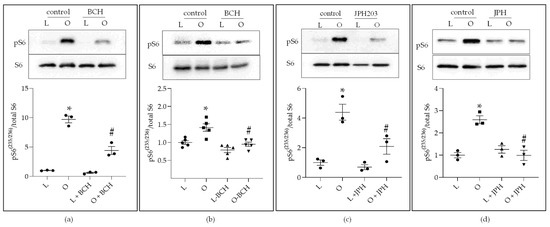 We hypothesized that LAT1 mediated increases in mTOR signaling. To investigate this hypothesis, we inhibited LAT1 activity with two LAT1 antagonists, BCH [38] and JPH203 [39]. Relative to L-ADS (L), O-ADS (O) induced mTOR signaling in vehicle-treated (control) MCF7 and T47D cells (Figure 6). This induction was inhibited by BCH (10 mM) (Figure 6a,b) and JPH203 (15 µM) (Figure 6c,d). These data suggest that LAT1 mediates increases in mTOR signaling in response to O-ADS.