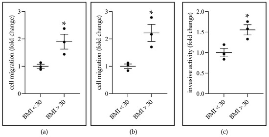 Finally, we questioned the effect of ADS on the migration and invasiveness of ER-positive BC cells. Experiments were carried out with breast PT-ADS. Breast PT-ADS was obtained from treatment-naïve BC patients. The results showed that PT-ADS obtained from patients with BMIs > 30 induced greater MCF7 cell migration (Figure 7a,b) and T47D cell invasiveness (Figure 7c) than PT-ADS obtained from patients with BMIs < 30. These results show that BMI and PT-ADS are functionally linked with inducing migratory and invasive activity of luminal BC cells.