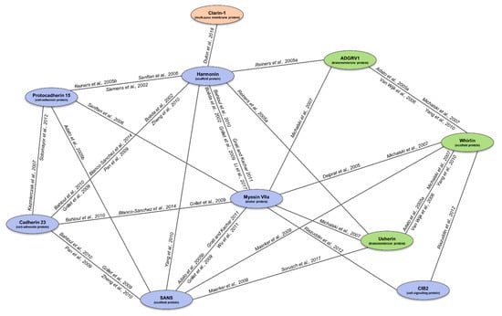 USH proteins interact directly with at least one other, thus building a protein network called the “USH interactome” (Figure 1) [137]. This protein complex can be explained because the alteration of any of the proteins results in the manifestation of almost the same clinical signs. It has been reported in several studies that this protein network is mainly present in the stereocilia of hair cells and the periciliary region of photoreceptors. In 2014, it was reported that the interactome was also associated with other proteins related to ciliopathies and retinopathies [73]. The USH interactome core is formed by whirlin, harmonin, and SANS. In the inner ear, the extracellular unions produced by cadherin 23 and protocadherin 15 are linked in this scaffolding core by the tethering with the cytoskeleton or other proteins, such as myosin VIIA. In addition, the interactome is also located in the synaptic region and the periciliary membrane of photoreceptors [1,73].