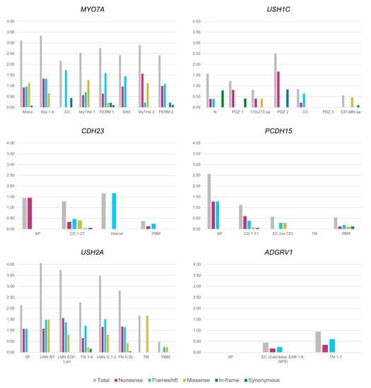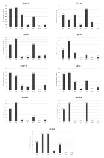 The heterogeneous distribution of every type of mutation described to date in each gene is depicted in Figure 2, which provides an overall representation of nonsense, frameshift, and splicing variants. Furthermore, the large size of the intronic regions in some genes related to a high number of repetitive regions, such as PCDH15 and USH2A, has led to more cases of large rearrangements compared to the other genes [206,207,208,209]. As a result, CNVs should be heeded in the capture designs and analyses by HTS or by implementing the method with supplementary techniques, such as Multiplex Ligation-dependent Probe Amplification or Comparative Genomic Hybridization arrays.
