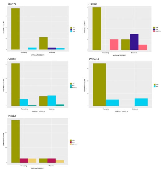 Our study is based on a specific Usher Syndrome database (https://grenada.lumc.nl/LOVD2/Usher_montpellier/USHbases.html, accessed on 6 July 2020; version of July 2020), which collects both genotypic and phenotypic up-to-date information about the USH genes; results are shown in Figure 2, Figure 3 and Figure 4.