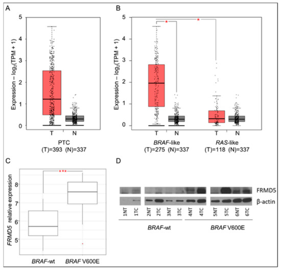 As a particular focus was given to the expressional status of FRMD5 in BRAF-mutated PTCs, an analysis of FRMD5 activation status was performed on the BRAF-like molecular subtype of PTC and compared with other TC types and non-tumor (control) specimens. Altogether, BRAF mutations and RET rearrangements are termed as BRAF-like carcinomas and present similar expression patterns. As the predominantly harbored mutation is BRAF V600E (observed in up to 80% of PTCs cases), most BRAF-like samples correspond to BRAF V600E-mutated TCs [13].