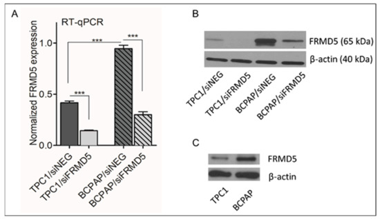 FRMD5 expression at transcript (A; RT-qPCR) and protein level (B; Western blot) in TPC1 and BCPAP cell lines transfected with FRMD5-specific siRNA (siFRMD5) and a scrambled control (siNEG). (C) Native yield of FRMD5 in non-transfected TPC1 and BCPAP cells determined by Western blot. β-actin served as a loading control. Graphical data are presented as mean ± SD. *** p < 0.0001.