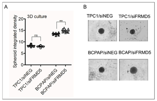 Additionally, the effect of FRMD5 depletion on the cells’ metastatic capability in vitro was investigated. A scaffold-free cell spheroid in a suspension model was used, which has been established to mimic the growth of naturally occurring tumors. It was found that deficiency of FRMD5 expression promotes the expansion of BCPAP cells. In contrast, no significant effect on the size and integrated density of spheroids for TPC1/siFRMD5 cells was observed in comparison to the control (TPC1/siNEG; Figure 5).