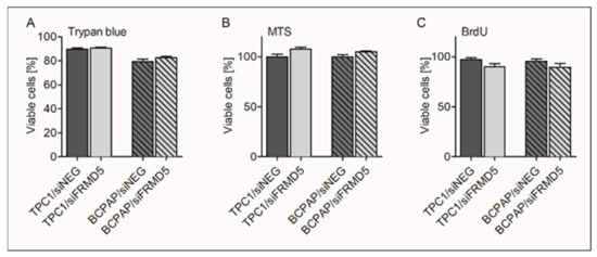 The obtained data collectively indicated that FRMD5 may be an important factor controlling the migration, invasiveness, and 3D cellular aggregation of PTC cells. In order to examine whether the observed pro- and antimetastatic properties of FRMD5 are associated with alternations in viability or proliferation, trypan blue-based, MTS [3-(4,5-dimethylthiazol-2-yl)-5-(3-carboxymethoxyphenyl)-2-(4-sulfophenyl)-2H-tetrazolium]-based and BrdU (5-bromo-2′-deoxyuridine) incorporation analyses were performed.