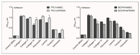To further study the properties of FRMD5 linked with metastasis, the effect of FRMD5-knockdown on the attachment capabilities of cells to extracellular matrix (ECM) proteins was investigated. A commercial ECM adhesion array assay was used for analysis, as described in the Materials and Methods section. After 72 h post-transfection, the tested cells were seeded on collagen I-, collagen II-, collagen IV-, fibronectin-, laminin-, tenascin-, and vitronectin-coated wells for 2 h. Cells seeded on wells coated with bovine serum albumin protein (BSA) served as a negative control. The cell adhesion characteristics showed that FRMD5 silencing led to opposite effects in the tested cells. Overall, FRMD5 suppressed the adhesion of TPC1 cells, as it was found that depletion of FRMD5 significantly increased the binding of TPC1 cells to collagen IV, laminin, and vitronectin. In contrast, FRMD5 likely acted as a promotor of cell-matrix interaction in BCPAP cells, as cells deficient in FRMD5 exhibited reduced adherence to collagen II, fibronectin, laminin, and tenascin (Figure 7).
