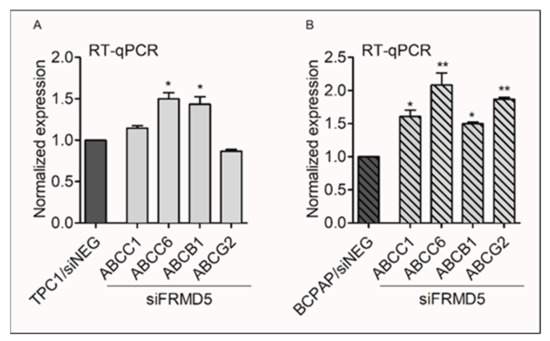 Since depletion of FRMD5 displays mixed oncogenic activity depending on the cancer cell mutational status, the expressional profile of P-gp-, BCRP-, MRP1- and MRP6-encoding genes was evaluated in FRMD5-knocked-down TPC1 and BCPAP cells using RT-qPCR. It was observed that suppression of FRMD5 results in upregulation of the tested MDR genes. BCPAP cells exhibited significant (up to two-fold) induction of all four MDR genes, while TPC1 siFRMD5-treated cells showed an increase in the expression of MRP6- and P-gp-encoding genes (Figure 8).