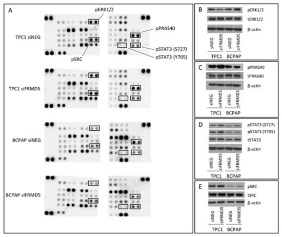In order to gain insight into biological pathways and genes associated with biological alterations resulting from FRMD5 depletion, the Proteome Profiler Human Phospho-Kinase Array (R&D Systems, Minneapolis, MN, USA) analysis was performed. This membrane-based sandwich immunoassay allows for a fast study of the antibody array to detect specific changes in phosphorylation of specific kinases involved in signal transduction of major regulatory pathways and compare their activation between the tested samples. TPC1 and BCPAP cells treated with siNEG (control set) and siFRMD5 were used. Among 37 examined phospho-kinases and 2 related total proteins, 17 molecules in total exhibited an altered activation status. Ten of the kinases were deregulated in both FRMD5-deficient TPC1 and BCPAP cell lines. Among deregulated proteins, YES kinase was suppressed, while STAT5, Chk-2, SRC, PRAS40, STAT3 (S727), RSK1/2 were upregulated (Figure 10A and Figure S2). Activation of two of the phosphokinases, AKT and CREB, was enhanced in TPC1/siFRMD5, but downregulated in BCPAP/siFRMD5 cells. Only one protein, c-JUN, was uniquely upregulated in TPC1 FRMD5-deficient cells, while only six kinases (ERK, p53, PYK2, STAT1, STAT6, p70 S6) were activated in siFRMD5-treated BCPAP cells. Additionally, Western blot analysis was performed to confirm the obtained immunoassay data. As shown in Figure 10B–E, the activation status of five randomly selected kinases (ERK1/2, STAT3, PRAS40, and SRC) overlapped with the phospho-kinase profiler data.