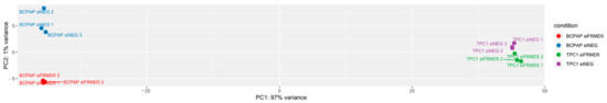 The integrity of the extracted RNA was evaluated using the 2100 Bioanalyzer instrument (Agilent Technologies, Inc., St. Clara, CA, USA) and the Agilent RNA 6000 Nano Kit (Cat No. 5067-1511, Agilent Technologies, Inc.). Samples with RIN (RNA integrity number) values of 8 or greater were taken to construct a cDNA library. The Ion AmpliSeq Transcriptome Human Gene Expression Panel (Cat No. A31446, ThermoFisher Scientific, Inc.) was applied for the preparation of the library, following the manufacturer’s protocol [23]. In brief, cDNA libraries were prepared with the Ion AmpliSeq Transcriptome Human Gene Expression Panel (ThermoFisher Scientific, Inc.) according to the manufacturer’s protocol. RNA samples were reverse-transcribed, and cDNA libraries were generated and quantified on the Bioanalyzer 2100 with a High Sensitivity DNA Kit (Agilent Technologies, Inc.). Eight barcoded library templates (50 pM) were mixed and loaded onto Ion PI chips with Ion Chef Instrument and sequenced on an Ion Proton Sequencer (ThermoFisher Scientific, Inc.) with the Ion PI Hi-Q Chef Kit, according to the manufacturer’s instructions. Signal processing and base calling was conducted using the Ion Torrent Suite v5.10 (https://github.com/iontorrent/TS, accessed on 17 January 2020). The read-outs were mapped to the hg19 AmpliSeq Transcriptome v1 genome with tmap v5.10. Read counts per gene were obtained with HTSeq-count [24] v0.6, using default parameters. Normalization and differential gene expression estimations were performed using DESeq2 [25] v1.18.1, using default parameters and options. A gene was considered differentially expressed when the adjusted p-value was less than 0.05. Functional analysis of differentially expressed genes was conducted with the Cytoscape [26] (v3.7.2) plugin ClueGo [27] (v2.5.7), on a database consisting of Biological Process (BP) and Molecular Function (MF) categories in Gene Ontology [28] (GO, version 8 May 2020). Benjamini–Hochberg p-value adjustment was used, and terms with adjusted p-value less than 0.05 were considered significant. GO enrichment visualization was prepared with GOplot [29] R package v1.0.2, using a reduction of similar terms (90% for BCPAP and 70% for TPC1).