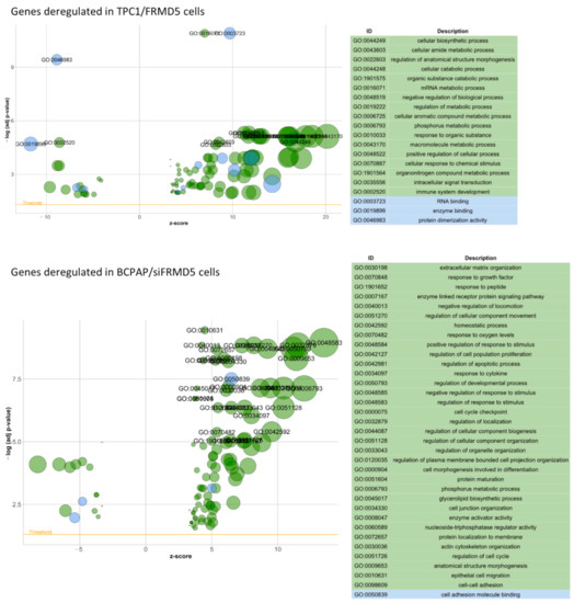 Bubble plots of significantly enriched Gene Ontology (GO) terms for the FRMD5-depleted TPC1 (top panel) and BCPAP (bottom panel) cells after term similarity reduction. Terms with adjusted p-value on the PHRED scale higher than 4 (TPC1) and 5 (BCPAP) are annotated. The area of the circles is proportional to the number of genes assigned to the term in the analysis. The z-score (horizontal axis) indicates whether the given term is more likely to be up- or downregulated. The threshold indicates the adjusted p < 0.05.