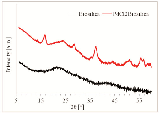 The X-ray diffraction pattern of the palladium(II)-doped diatom biosilica, recorded in a wide-angle range of 2Θ permitted identification of palladium(II) chloride nanoparticles on the basis of the reflexes characteristic of this compound at 16.7°, 27.1°, 28.7°, 37.7°, 50.1°, 51.6°, 56.0°, 57.1° (Ref. Code: 00-001-0228).