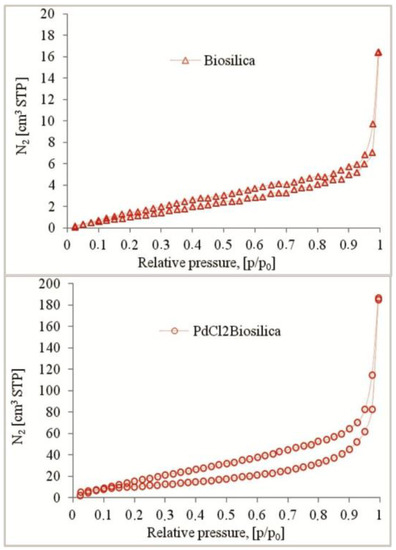 The low-temperature nitrogen adsorption/desorption isotherms of diatom biosilica and PdCl2 biosilica are presented in Figure 2. According to the IUPAC classification, the adsorption/desorption isotherm belongs to combination types I and II [54]. Type I is characteristic of microporous materials having relatively small external surfaces, while type II corresponds to nonporous or macroporous materials. The isotherm recorded for the obtained materials shows a hysteresis loop of H4 type, which indicates the presence of straight slit pores [55].
