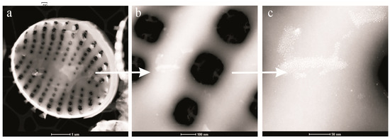The siliceous walls of diatom frustules are decorated by original pattern of ordered structural features such as pores, ridges, ribs, spikes or spines creating the most spectacular example of three-dimensional (3D) structured silica materials of biological origin. The diatom’s frustule surface contains a high level of the silanol groups (Si-OH) and siloxane bridges (Si-O-Si) [34,35,37].