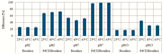 The results show that the biosilica and PdCl2 biosilica exhibit different abilities to induce photocatalytic degradation of MO in various pH conditions: acid, neutral and alkaline. The efficiency of MO degradation was almost twice higher for PdCl2 biosilica compared to unmodified biosilica under all pH conditions. The maximum efficiency of MO degradation (52% for biosilica and 98% for PdCl2Biosilica) was achieved in a neutral medium at pH 7. A fairly high efficiency (72%) of MO degradation in an acid medium was obtained in the presence of PdCl2Biosilica. The temperature increase in the range from 25 to 65 °C did not show a visible impact on the effectiveness of the photocatalytic degradation of the dye (see Figure 5).