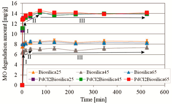 The kinetics of MO photocatalytic degradation at different temperatures under UV irradiation using PdCl2 biosilica and biosilica are shown in Figure 5. The kinetics is expressed by kinetic curves resealing three different stages of MO photocatalytic degradation. The initial rapid stage is followed by the second much slower process, and then by the stage of equilibrium with the weak fluctuation effects. The character of the process is very similar for biosilica and PdCl2 biosilica (the shape of the kinetic curves is the same), but the dye degradation efficiency is almost twice as high for PdCl2 biosilica as for Biosilica. In the initial step, rapid photocatalytic degradation of the test dye takes place within one minute with an efficiency of about 45% and 85% for biosilica and PdCl2Biosilica, respectively. The second stage lasts for about 35 min with the use of biosilica and about 75 min using PdCl2 biosilica. After reaching equilibrium, the maximum efficiency for the two tested basilica samples was 56% and 97%, for pristine and modified samples respectively. The high efficiency of MO photocatalytic degradation in the very rapid first stage may indicate that the surface layer reactions control the process. The contact time required to achieve equilibrium (75 min) was used in the next batch study of the isotherm of MO photocatalytic degradation over PdCl2 biosilica at 25 °C.
