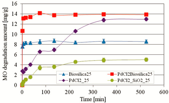 For comparison, the photocatalytic degradation of MO using only a palladium(II) chloride and commercial amorphous silica doped with PdCl2 (PdCl2_SiO2) as catalysts was also studied (Figure 6). The shape of the MO degradation kinetic curves using pure PdCl2 and biosilica doped with PdCl2 differs significantly. In the case of PdCl2 a much slower dye degradation process and a correspondingly much delayed time (345 min) to reach equilibrium were observed. Once equilibrium was reached, the maximum MO degradation efficiency over PdCl2 was 87%. Photocatalytic degradation of the dye by commercial amorphous silica also occurs much slower compared to pure biosilica or PdCl2 biosilica and the maximum efficiency of MO degradation during equilibrium is only 32%.