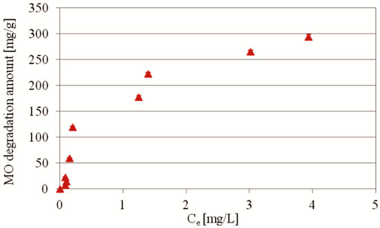 Isotherm of MO photocatalytic degradation as a function of the initial concentration of MO in the presence of PdCl2 biosilica photocatalyst. Experimental conditions: m (biosilica)—10 mg; t = 75 min; T = 25 °C; C0(MO)—5–200 mg/L; V (MO solution)—15 mL; pH—7.0.