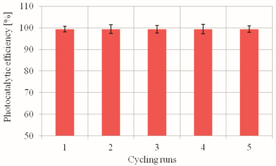 The stability of photocatalyst recycling capacity is an important indicator of its possible application. Five cycling runs of the photocatalytic degradation of MO dye was performed to evaluate the photocatalytic stability of reused photocatalyst. The results concerning the reusability of PdCl2 biosilica photocatalyst are shown in Figure 9. As indicated, a high MO photodegradation is maintained after five cycle rounds of the photocatalyst reuse, which proved that the prepared PdCl2 biosilica photocatalyst has a very good recyclability. The fears that immobilized nanoparticles of palladium(II) chlorides may be insufficiently stable in an aqueous solution of the dye were not confirmed in our experiment.