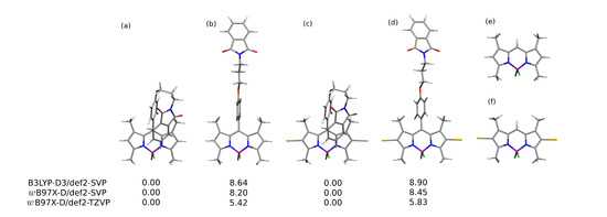 - Spiegel, J.D.; Kleinschmidt, M.; Larbig, A.; Tatchen, J.; Marian, C.M. Quantum-Chemical Studies of Excitation Energy Transfer Process in BODIPY-Based Donor-Acceptor Systems. J. Chem. Theory Comput. 2015, 11, 4316. [Google Scholar] [CrossRef]