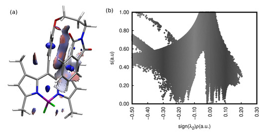 The relative B97X-D/def2-SVP energy of the folded structures presented in panels (a) and (c) of Figure 2 are by 8.20 and 8.45 kcal/mol more favorable than the unfolded ones (panels (b) and (d) of Figure 2), respectively for 1 and 2. The increase in the basis set to the def2-TZVP one causes the noticeable decrease in the relative energy to 5.42 and 5.83 kcal/mol for 1 and 2, respectively. The substitution of 1 by the iodine in the 2 and 6 positions, leading to the 2 structure, does not significantly modify the relative energy between the most stable bent and elongated (unfolded) form. These energies were compared to the phthalimide-BODIPY core interaction energy, calculated for the optimized complexes in the supermolecular manner with the B3LYP-D3/def2-SVP approach (for the corresponding structures, see Supporting Information). For the unsubstituted core 3 (compare Figure 2, panel (e)) this interaction amounts to −13.22 kcal/mol, while iodination does not change the stabilization significantly (intermolecular interaction energy of 4 equal to −13.27 kcal/mol; see Figure 2, panel (f)). Therefore, one can assume that the main contribution to the stabilization of the folded structure arises from the dispersion interaction between the aromatic parts in the molecule. The noncovalent interactions analysis in 1 confirms the importance of the intramolecular stabilizing Van der Waals forces (see Figure 3, low-density low-gradient spikes close to zero in panel (b)). A comparison of the intermolecular interactions in the bent and unfolded dyes dimers was performed in our previous work [57]. These data unequivocally show that the elongated, unfolded molecules can benefit stronger from the good matching of the aromatic parts of the molecules in dimers for effective dispersion attraction. The B97X-D/def2-SVP supermolecular interaction energy in the 1 unfolded dimer was estimated as almost 6 kcal/mol stronger than that for the bent dimer. A similar effect is observed for 2; however, here, the energy difference between the unfolded and bent dimer decreases slightly to about 4 kcal/mol. Thus, it is clear that the conformation of the investigated species affects their possible aggregates to a high extent.