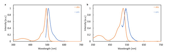 - Brouwer, A.M. Standards for photoluminescence quantum yield measurements in solution (IUPAC technical report). Pure Appl. Chem. 2011, 83, 2213–2228. [Google Scholar] [CrossRef] [Green Version]