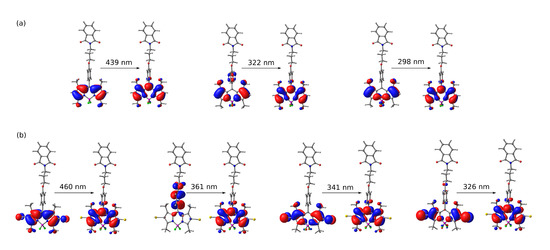 Frontier molecular orbitals of (a) 1 and (b) 2 in acetonitrile involved in most intensive transitions (M06-2X/def2-TZVP/PCM); unfolded conformations presented for clarity.