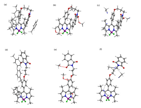 In order to shed more light on the nature of the solute–solvent interaction, particularly in the case of the toluene solutions, theoretical calculations for the BODIPY, explicitly solvated with three solvent molecules, were performed for toluene as well as for methanol and acetonitrile within the B3LYP-D3/def2-SVP approach. The optimized complexes of 1 with three molecules of toluene, methanol and acetonitrile are presented in Figure 6. The interaction of the single toluene molecule with BODIPY is of the order of the intramolecular dispersion stabilization (−9.08 kcal/mol for 1 and −12.39 to −9.50 kcal/mol for 2, depending on the arrangement of the aromatic rings). Aromatic rings of toluene eagerly stack either with the BODIPY core or with the phthalimide substituent. The phenyl ring in the meso-position of the BODIPY molecule is, on the other hand, protected by the methyl groups in 1 and 7 positions; due to sterical reasons, it does not create an effective stacked complex. On the other hand, the smaller size of the acetonitrile and methanol molecules allow to penetrate easily, even in more crowded areas, and align parallel to the phenyl ring. However, the hydroxyl group of the alcohol prefers to form strong hydrogen bonds to the ether oxygen rather than to encounter dispersion or C-H... interactions to the phenyl ring. The interaction energy of the methanol molecules with 1 is of the order of 6–9 kcal/mol, depending on their position, and substitution with the iodine atom does not influence these interactions significantly.