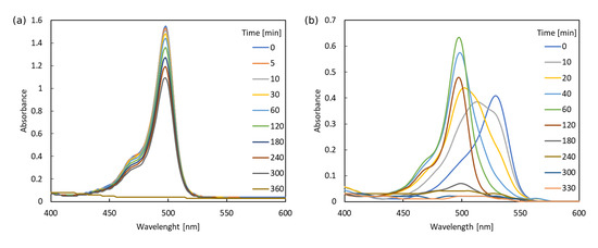 A different course of the photodegradation process was observed for 2 (chromatograms not shown). Already after 5 min of irradiation, the peak of the substance P9 occurs in the chromatogram with the maximum absorption at 512 nm. After the irradiation time t = 20 min, another peak appears in the chromatogram, with = 500 nm. The retention time for this substance is = 8.03 min. Comparing the retention times for the product appearing in Figure 11 and the experimental results in the spectroscopic part of the study (Figure 7), it can be deduced that it is the deiodinated system 1. Thus, 1 is one of the products of photodegradation that occur under the influence of the irradiation of 2 during fragmentation, according to the photodegradation mechanism I (PM-I), presented in Figure 8. The corresponding absorption spectra of the substances formed as a result of the photochemical changes during irradiation t = 20 min are presented in panel (a) of Figure 13. After the irradiation time t = 35 min, the signals from the subsequent photoproducts appear. One of them exhibiting the maximum absorption at 500 nm can be identified as P7, occurring also in the photodegradation pathway for 1. Additionally, it is important to note that the P7 (also observed for pristine 1 photodegradation) and P9 products absorb only in the UV range.