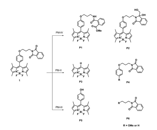 The strength of the bonds in the BODIPY molecule and the commonly encountered photodegradation mechanisms in similar systems [30] indicate that several possible ways of photodegradation should be taken into account in the present study. Five possible mechanisms are considered here: (1) the photodetachment of iodine atoms leading from 2 to 1 photodegradation products (this way is denoted further as the photodegradation mechanism I, PM-I, Figure 8), (2) the photodetachment of the meso-substituent by the BODIPY core-phenyl ring C-C bond breaking [30] (photodegradation mechanism II, PM-II, Figure 9), (3) C-O bond photolysis in the meso-substituent (photodegradation mechanism III, PM-III, Figure 9), (4) the phthalimide moiety destruction (photodegradation mechanism IV, PM-IV, Figure 9), and finally (5) the photooxidation of the BODIPY core as suggested by Mula et al. [30] (photodegradation mechanism V, PM-V, Figure 10). The observed photoproducts are further on denoted as PX, where X is the subsequent number roughly in agreement with the order of their appearance in Figure 8, Figure 9 and Figure 10.