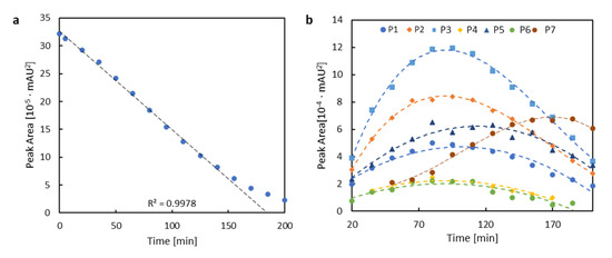 During the irradiation time from t = 0 min to t = 150 min, the concentration of 1 decreases linearly, which can be seen in Figure 12a). This indicates that the photodegradation process for 1 in dilute solution follows the zeroth-order kinetics. The analysis of the composition of the mixture after irradiation shows that P1–P7 products reach their highest concentration after the irradiation time of 80 min (Figure 12b). After this time, the concentration of these substances—estimated as the peak area in the chromatogram—decreases upon irradiation. Only the P7 product increases its concentration almost throughout the entire process, which suggests that as a result of the photochemical changes, the chemical bonds may break with the dissociation of a part of the molecule that absorbs only UV radiation.