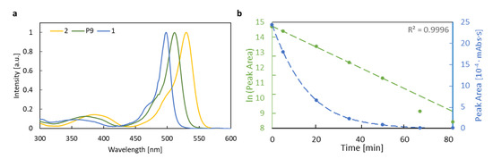 Absorption spectrum for the products of photodegradation in methanol after exposure time t = 20 min (a), the correlation between the area of the chromatographic peak (blue) and the relationship between the natural logarithm of the area of the chromatographic peak A (green) and the time (b) (estimated rate constant k = 1.2·10−4 ).