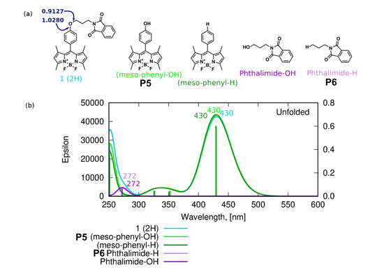 The calculated Wiberg bond indexes for the C8–C17 bond linking the BODIPY core with the meso-substituent reveal relatively weak bonding of this fragment (1.0308 for unfolded 1 structure); therefore, one of the considered photodegradation mechanisms, depicted in Figure 9, involves this particular decomposition pathway (PM-II). The calculated absorption spectra for the meso-substituent and its BODIPY core counterpart (denoted here as 3) is presented in panel (b) of Figure 15. One is aware that the structure of the investigated meso-substituent bearing the phenyl ring and the phthalimide moiety bound by the aliphatic chain and ether oxygen does not exhibit absorption in the visible region and only weakly depends on the conformation of the chain. Therefore, its presumptive presence in the photodegradation products mixture is of no importance for the recorded absorption spectra after irradiation (see Figure 7). The detachment of the meso-substituent causes the hypsochromic shift of the most intensive absorption band by about 6 and 15 nm for the unfolded and bent conformers, respectively.