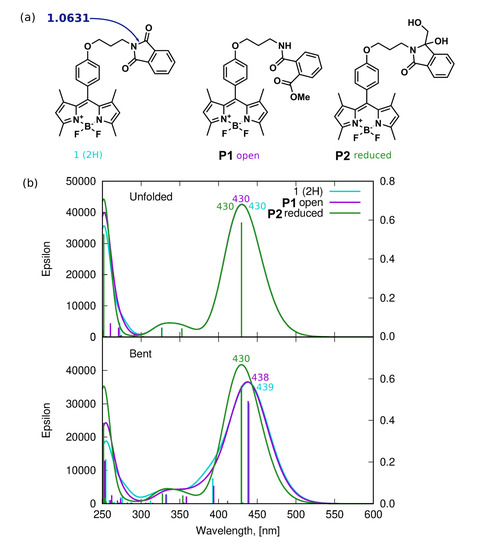 Another possibility of the influence of UV irradiation is the destruction of the phthalimide moiety itself, presented in Figure 9 (photodegradation mechanism IV, PM-IV). The Wiberg bond indexes for the N25–C26 bonds likely to break in the phthalimide moiety are, indeed, close to 1.0 (see Table 2), legitimizing this mechanism. The corresponding spectra of hypothetical products of this process presented in panel (b) of Figure 17 indicate that the only modification in the spectrum is the small blue-shift for the bent conformer (439 vs. 430 nm). Therefore, also this pathway of photodegradation of the investigated BODIPY dyes seems to not introduce the changes observed experimentally for the mixture irradiated for a long time (Figure 7).