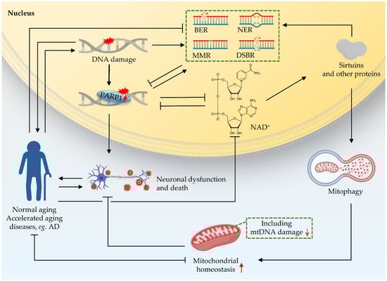 - Fang, E.F.; Scheibye-Knudsen, M.; Brace, L.E.; Kassahun, H.; SenGupta, T.; Nilsen, H.; Mitchell, J.R.; Croteau, D.L.; Bohr, V.A. Defective Mitophagy in XPA via PARP-1 Hyperactivation and NAD+/SIRT1 Reduction. Cell 2014, 157, 882–896. [Google Scholar] [CrossRef] [PubMed] [Green Version]