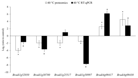 To correlate the proteomic analysis results, six genes were selected to characterise the level of their transcript accumulation using RT-qPCR. Three genes (Bradi1g52050, Bradi4g09417 and Bradi4g09430) were selected based on the highest differences in the accumulation of the proteins between the control and the 40 °C treatment, and the three other genes (Bradi1g38780, Bradi1g25517 and Bradi1g58997) were selected to represent proteins from different families. The RNA for the control and treated leaves were isolated as described previously []. The primers that were used are listed in Table A1. The detailed procedure for RT-qPCR was also previously described []. Since we have already shown that the level of expression of the polyubiquitin gene (Bradi1g32860) was stable under different temperature treatments it was used as a reference []. The analysis was performed using the 2−∆∆CT method. The control treatment (at 21 °C) was used as the reference group. Three biological replicates were performed with two technical replicates for each. The analysis of the statistical differences between the treatments and the control was done with Student’s t-test (TIBCO Software Inc., Palo Alto, CA, USA). As mentioned in Section 4.4, the proteomics data were log-transformed, and the Student’s t-test with the permutation-based FDR set to 1% was used for statistical analysis of differences between the treatments and the control (Perseus, Max-Planck Institute of Biochemistry, Martinsried, Germany).