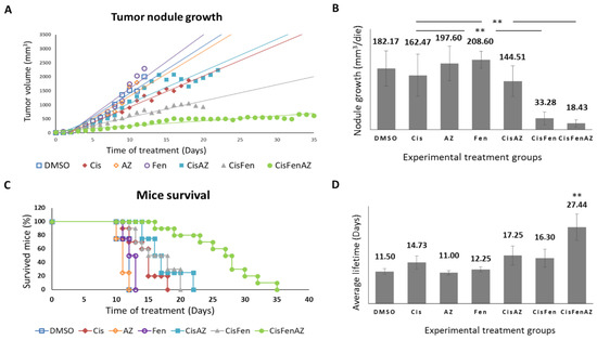 Figure 1 reports the growth rate of tumor nodules and mice survival in the different experimental groups. Single treatments with acetazolamide or fendiline per se do not reduce tumor nodule growth, as shown by the daily recordings of nodule volume, which did not differ from DMSO-treated controls; cisplatin alone, at the dose used, had a moderate effect, but, in line with our previous results [7], the combined cisplatin/fendiline treatment reduced tumor growth much more effectively than low-dose cisplatin-based chemotherapy; conversely, no enhancing effects were observed in the co-treatment with cisplatin and acetazolamide, which induced an antitumor effect comparable to cisplatin alone. Interestingly, in the mice treated with the combination therapy which included all three molecules (Cis/Fen/Az), there was a reduced nodule growth rate equal to approximately one tenth of that observed in the vehicle-treated control mice, and if compared with the Cis/Fen treatment, the growth rate halved (Figure 1A,B). Moreover, it was observed that the disease was stable in these mice for up to 35 days, suggesting a sustained activity of the triple-drug combination. Other groups were sacrificed upon reaching the established 2.2 mm3 mass volume threshold of the nodule.