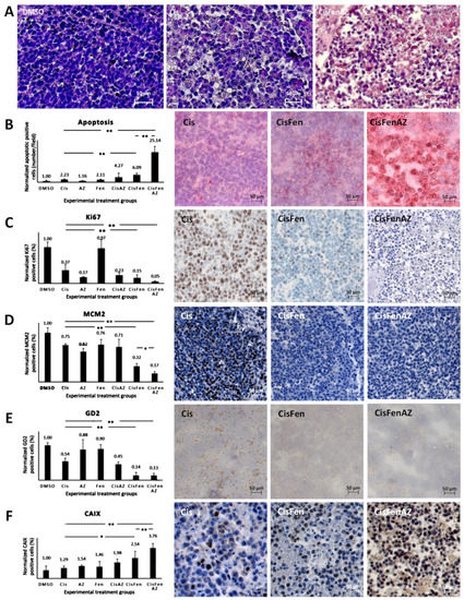 Next, we assessed whether the addition of acetazolamide to previous treatments induced the specific/preferential targeting of the most malignant cells. GD2 is a disialoganglioside antigen whose expression is associated with neuroectodermal origin tumor cells, and is considered a marker of NB malignant cells [26]. We show that GD2-positive cells in sections from both Cis/Fen- and Cis/Fen/Az-treated mice were reduced to a similar level but the presence of these cells was significantly lower (p < 0.01) than in nodules from cisplatin-treated mice, and from DMSO-treated control animals (Figure 2E).