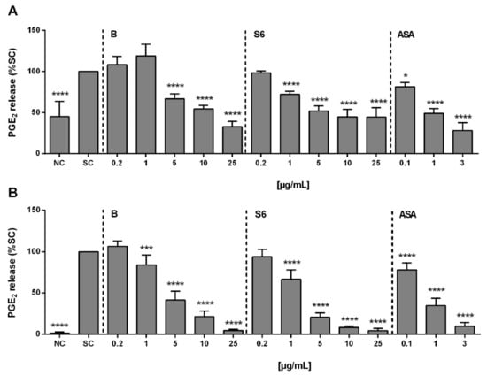 The effects of Salix extracts and acetylsalicylic acid (ASA) on the inhibition of PGE2 release from activated peripheral blood mononuclear cells (PBMCs). Cells (1 × 106 cells/mL) were pre-treated with Salix extracts B or S6 or ASA 30 min before stimulation for another 24 h with either (A) SARS-CoV-2 peptide mixture (1 µg/mL) and IL-1β (50 ng/mL) or (B) LPS (100 ng/mL). Negative control (NC): cells only. Solvent control (SC): 1% distilled water in activated cells. The amount of PGE2 in the culture supernatant was measured using an ELISA kit. Bars are the means ± standard deviation (SD) (n ≥ 3). * p < 0.05, *** p < 0.001, or **** p < 0.0001 versus the SC group.