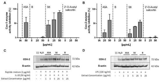 The effects of Salix extracts and ASA on COX1/2 enzyme activity. Human recombinant (A) COX-1 or (B) COX-2 enzyme activity was quantified by detection of prostaglandin PGF2α production using the ELISA technique. The inhibition (%) was calculated by comparison to the Initial Activity (IA) of the respective COX enzyme. Bars are the means ± SD (n ≥ 3). Western blot of COX-2 protein expression. PBMCs (1 × 106 cells/mL) were pre-treated with Salix extracts or ASA for 30 min and subsequently stimulated with (C) 1 µg/mL peptide mixture and 50 ng/mL IL-1β or (D) 100 ng/mL LPS for another 3 h. Cells were lysed, and the total lysate was subjected to western blotting. Representative immunoblots of COX-2 and β-actin (loading control) are shown.