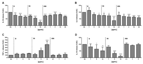 The effects of Salix extracts and ASA on the inhibition of cytokine secretion from SARS-CoV-2 peptide/IL-1β-stimulated PBMCs. Cells (1 × 106 cells/mL) were pre-treated with Salix extracts or ASA for 30 min before stimulation for 6 h (TNF-α detection) or 24 h (interleukins). The amount of (A) IL-1β, (B) IL-6, (C) TNF-α, and (D) IL-10 in the cell supernatant was measured using the ELISA technique. SC: 1% distilled water in activated cells. Bars are the means ± SD (n ≥ 3). * p < 0.05, ** p < 0.01, *** p < 0.001, or **** p < 0.0001 versus SC group.
