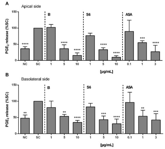 Using a mixture of different pro-inflammatory stimulators on differentiated Caco-2/HT29-MTX (90:10) co-cultured cells, we aimed to simulate intestinal inflammatory processes, as described in a previous study []. As shown in Figure 4, significant inhibition of PGE2 release was observed with the Salix extracts at ≥5 µg/mL (extract S6 > extract B), whereas this was already at 1 µg/mL with ASA in both the supernatant from the apical (Figure 4A) and basolateral (Figure 4B) sides of activated Caco-2/HT29-MTX co-cultured cells.