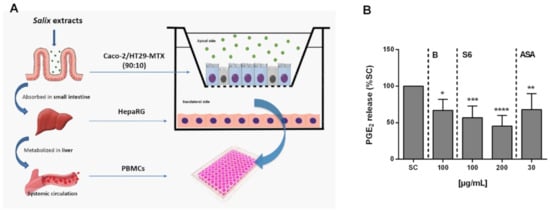 Next, an in vitro Caco-2/HT29-MTX (90:10) model was employed that mimicked both enterocytes and goblet cells of the small intestine, together with hepatocyte-like HepaRG cells. Using this model, we aimed to simulate the process of oral drug absorption and metabolism [] before assessing the anti-inflammatory activity of Salix extracts and ASA in activated PBMCs again. A schematic of the in vitro model is given in Figure 5A. As shown in Figure 5B, the inhibition of PGE2 release by Salix extracts and ASA was still evident after intestinal absorption and liver metabolism.