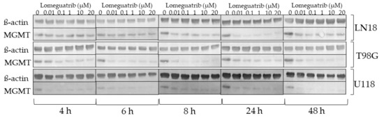 Western Blot analysis of LN18, T98G, and U118 cell lines. Increasing concentrations of lomeguatrib were added for 4 h, 6 h, 8 h, 24 h, and 48 h. Shown are the representative blots for the protein levels of MGMT and ß-actin.