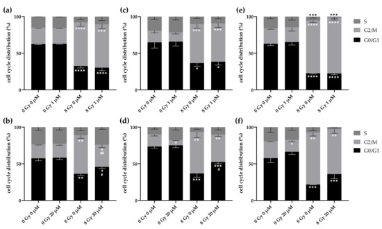 G2/M cell cycle phase was significantly decreased by 8 Gy ionizing radiation combined with 20 µM lomeguatrib. (a) and (b) show LN18, (c) and (d) show T98G, and (e,f) show U118 cell cycle distribution 24 h after irradiation. Bars present the mean values, and error bars the standard deviation of at least three replicates. Asterisks indicate significances of the different treatments versus the 0 Gy 0 µM lomeguatrib sample of the respective cell cycle phase (Student’s t-test; * p 0.05, ** p 0.01, *** p 0.001, **** p 0.0001), while hash symbols represent significances between 0 Gy 0 µM to 0 Gy 1 µM or 20 µM and 8 Gy 0 µM to 8 Gy 1 µM or 20 µM.(Student’s t-test; # p 0.05, ## p 0.01).