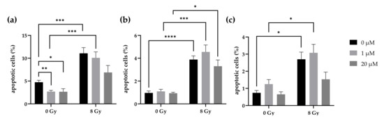 Apoptosis in (a) LN18, (b) T98G cells, and (c) U118 cells upon lomeguatrib and radiation treatment. Bars present the mean values and error bars the standard error of the mean of at least three replicates. (Student’s t-test; * p 0.05, ** p 0.01, *** p 0.001, **** p 0.0001).