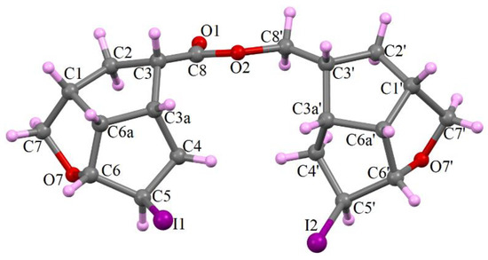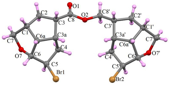 - Compound 6c provided suitable crystals for single crystal X-ray determination and its structural configuration is presented in Figure 3. As we observed in NMR spectra, the molecule 6c is an ester of the acid 3c, formed in Jones oxidation of the alcohol 2c, with the starting un-oxidized alcohol 2c, presented in the reaction mixture until its complete oxidation.