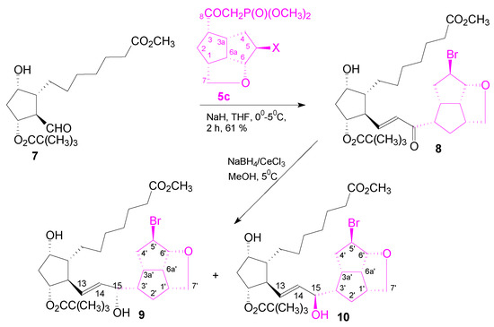 - Tănase, C.; Căproiu, M.T.; Drăghici, C. New ß-ketophosphonates for the synthesis of prostaglandin analogues. 2. Phosphonates with a bicyclo[3.3.0]octene and bicyclo[3.3.0]octane scaffolds linked to the ß-ketone group. New J. Chem. 2020, 44, 20405–20410. [Google Scholar] [CrossRef]