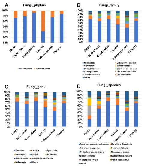 2.7. Comparison of Identified Fungi in Different Garlic Tissues