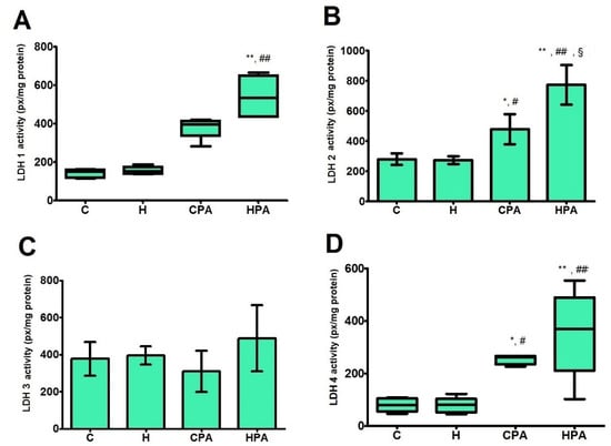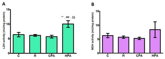 Total activity of LDH was significantly increased in the HPA group (10.040 ± 1.154 mU/mg protein) in comparison to all groups (C: 6.402 ± 0.759 mU/mg protein, p < 0.01; H: 6.142 ± 0.321 mU/mg protein, p < 0.01; CPA: 5.708 ± 0.468 mU/mg protein, p < 0.01) (Figure 2A).