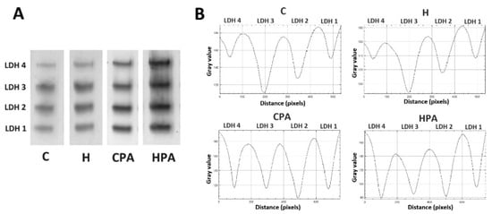 Representative zymograms lactate dehydrogenase isoforms (A) and representative densitometric curves lactate dehydrogenase isoforms (B) in rat cardiac tissue. C—0.9% NaCl; H—homocysteine; CPA—0.9% NaCl + physical activity on treadmill; HPA—homocysteine + physical activity on treadmill.